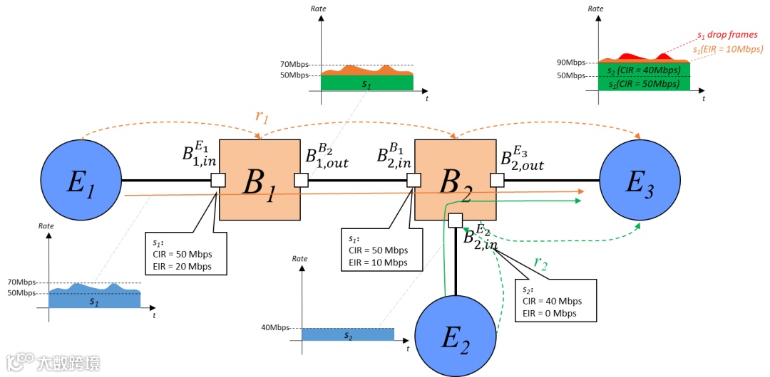 • 对于网桥B2入端口到达的流s2希望保证40Mbps(即承诺信息率(CIR))。由于网桥B2的出口端口的速率不超过100Mbps,则需要将流s1的超额信息速率(EIR)降低到10Mbps。