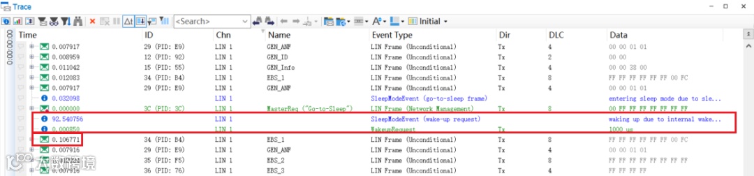 如下图,触发睡眠事件后,主节点发送3C报文,总线无LIN帧传输,符合预期。