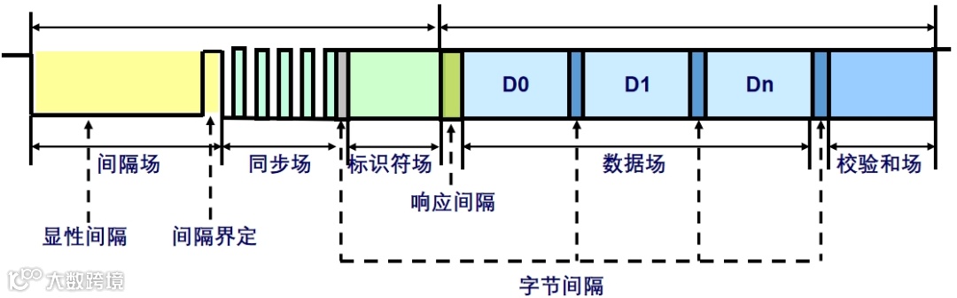LIN数据帧通常由同步间隔场、同步场、标识符场(帧ID)、数据场、校验和场组成,如下图所示: