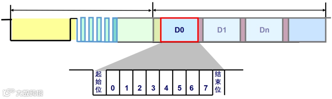 对于同步场、标识符场(帧ID)、数据场、校验和场,都固定为1个字节,每个字节占10个bit位,包括起始位和结束位,如下图所示: