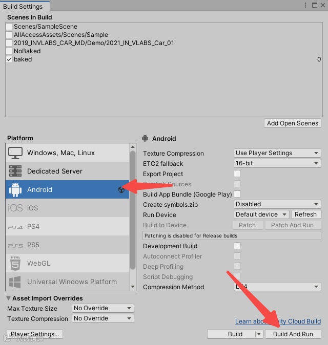 ▷ 选择安卓平台并且插上测试安卓手机BuildAndRun