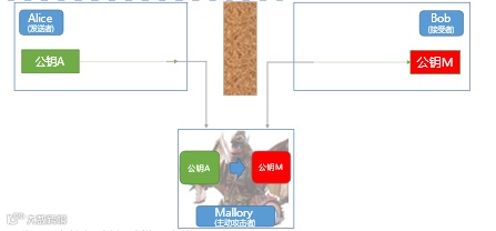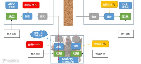 主动攻击者还可能通过对消息进行拦截、替换、伪装,实施臭名昭著的中间人攻击。所谓中间人攻击,就是主动攻击者混入发送者和接收者的中间,对发送者伪装成接收者,对接收者伪装成发送者的攻击方式,在这里,Mallory就是“中间人”。教科书式的讲法比较抽象,其实这种攻击模式颇似“梁山伯与祝英台”式的棒打鸳鸯的桥段,让我们一起看下: