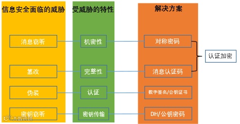 最后,让我们来整理下上文描述的通信过程中的威胁、特性及相应解决方案,构成称为“密码学家的工具箱”的密码学套件: