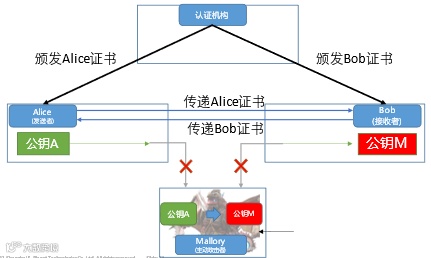 公钥在传输过程中被拦截、替换,数字签名被破解,安全通信再次土崩瓦解,好像我们又回到了原点?但让我们重新整理下思路,会发现其实我们已经离“真相”只差了一步:最开始传输的加密密钥是无法公开的,而现在我们需要传输的公钥却是可以公开给任何人。传输需要保密的东西问题转化为了传输不需要保密,只需确保真实性的东西,就好比由最初需要是传输的是银行卡密码,转变为只需传输身份证号即可。而在虚拟网络上身份的证明被称为公钥证书(Public-Key Certificate,PKC),里面记有姓名、组织、邮箱地址等个人信息以及属于此人的公钥,类比于政府机关,网络中由认证机构CA(Certification Authority)来管理颁发公钥证书。