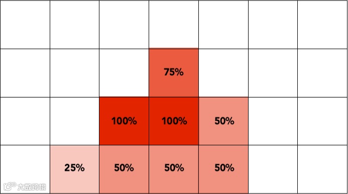 接下来,我们需要根据采样点是否在三角形内来求出三角形对这个像素的覆盖率。判断点是否在三角形内很简单,我们只需对三条边分别进行叉积,结果如果同向的话那么说明该点在三角形内。如下图所示,改像素的覆盖率为75%。