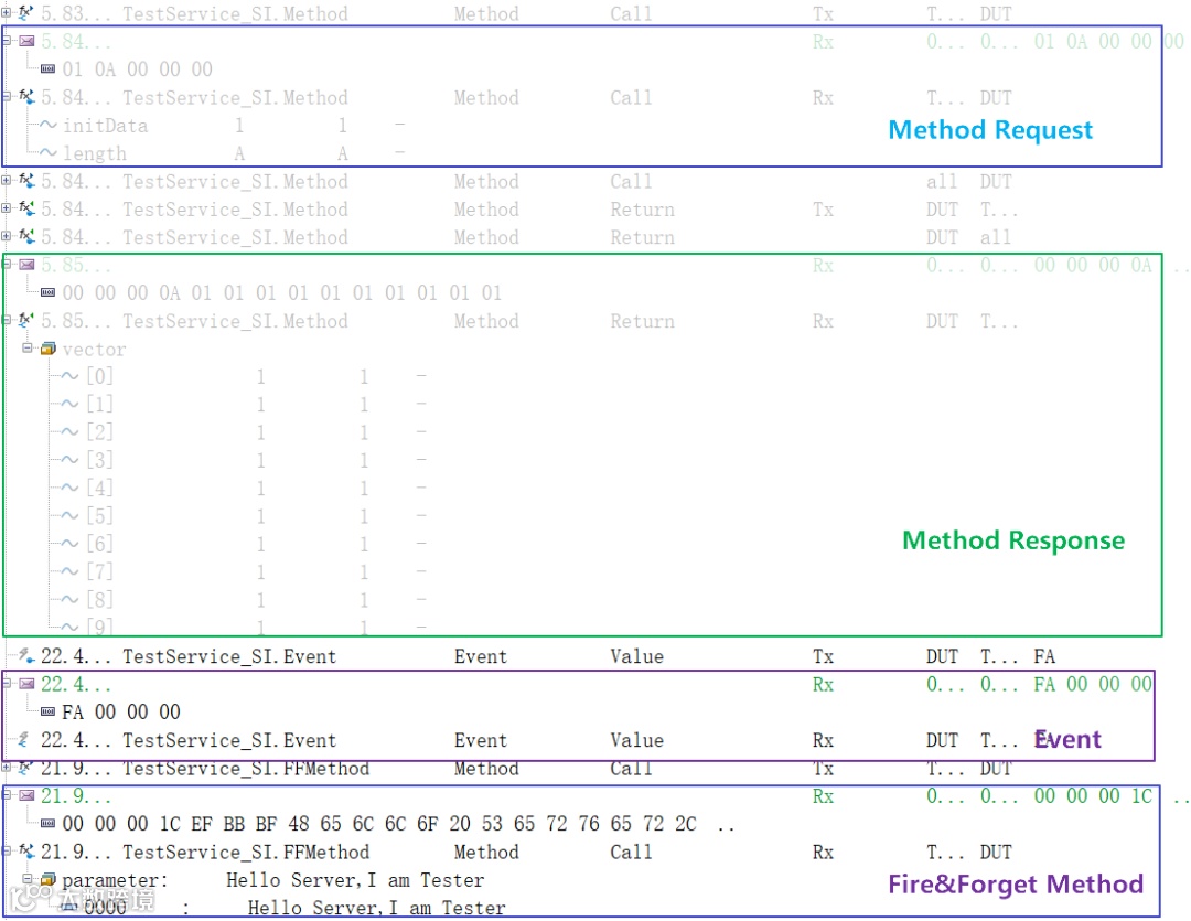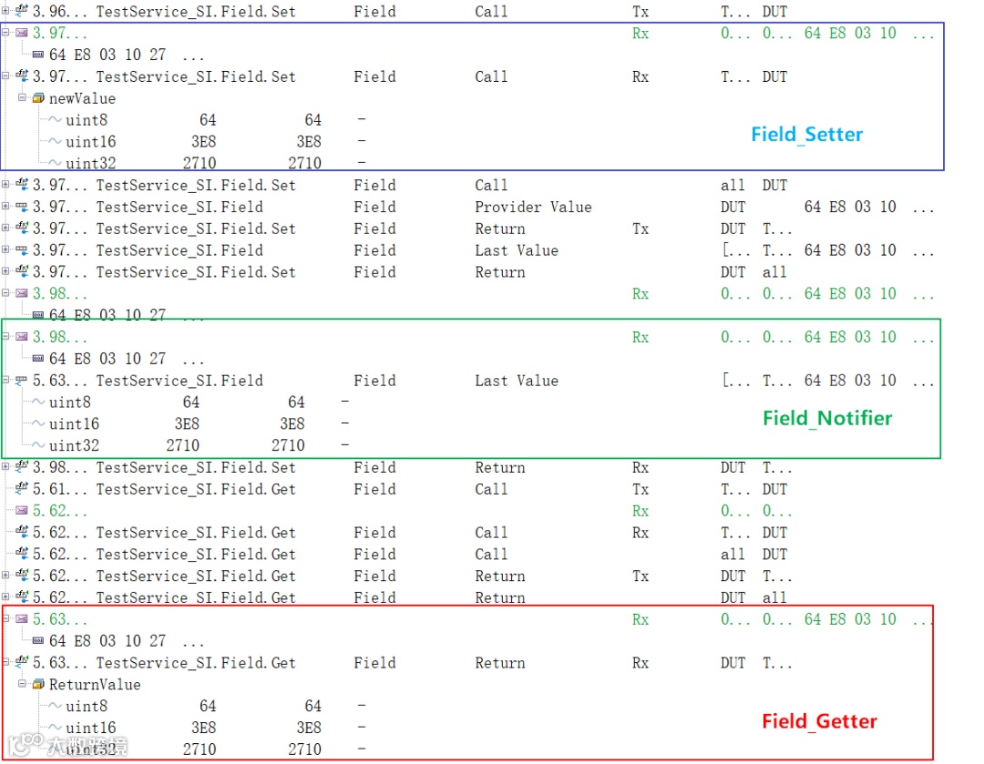 对于Fire&Forget Method,Filed Getter/Setter接口的仿真方法参照普通Method的API即可实现。在Communication Setup这种仿真环境中Field Notifier的触发行为是自动的,当Field的值发生变化之后Notifier就会自动地发送给订阅该Notifier所属事件组的Client。由于篇幅的原因此处就不详细展开了。