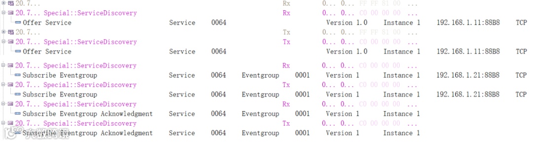 由于Communication Setup已经集成了SOME/IP SD的功能,只需要在PREEvision中配置好SOME/IP SD相关的参数,无需相关的仿真程序即可在trace窗口中看到SOME/IP SD相关报文,如下如所示。