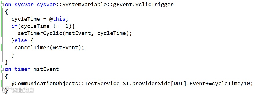 本示例实现的是Event的周期型发送行为,当用户在Panel上设置好周期之后,在CAPL中监听关联了周期的环境变量的变化,并通过一个定时器实现Event的周期型发送行为,如下图所示。