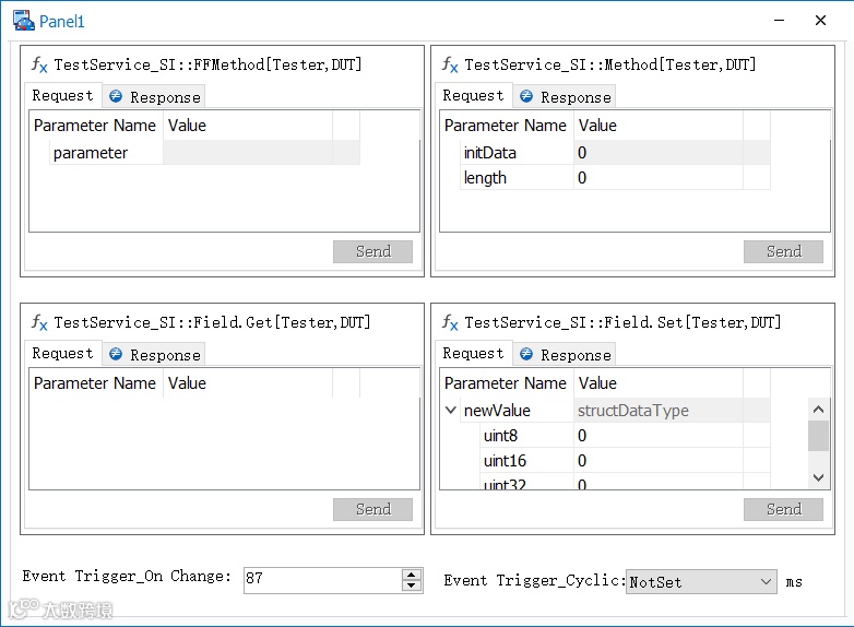 下图所示的Panel面板示例中包含一个Method,一个Fire&Forget Method,一个Event以及一个同时包含Getter、Setter、Notifier的Field的服务接口,其中周期型事件的发送行为会在CAPL中实现。
