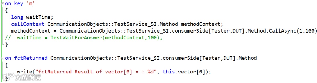 Method的响应行为需要在服务提供方所对应的Participant关联的CAPL中去实现(下文简称服务端)。服务端监听客户端的请求,当收到请求之后即可进入Method的程序中。在实际项目中根据Method的真实功能编写功能实现代码即可。服务端监听客户端请求的函数为on fctCalled。