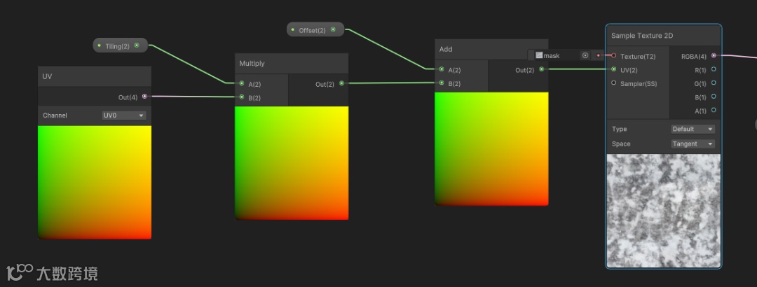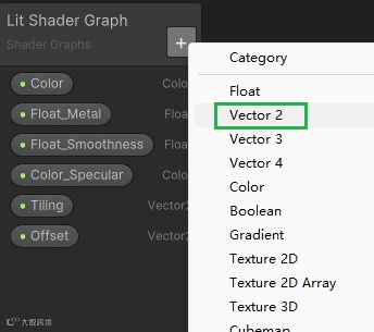 然后在属性面板点击加号,添加Vertor 2 的属性输入,分别命名为tiling 和offset,将tiling 与UV相乘,offset 与UV相加,如图3.3.4所示。