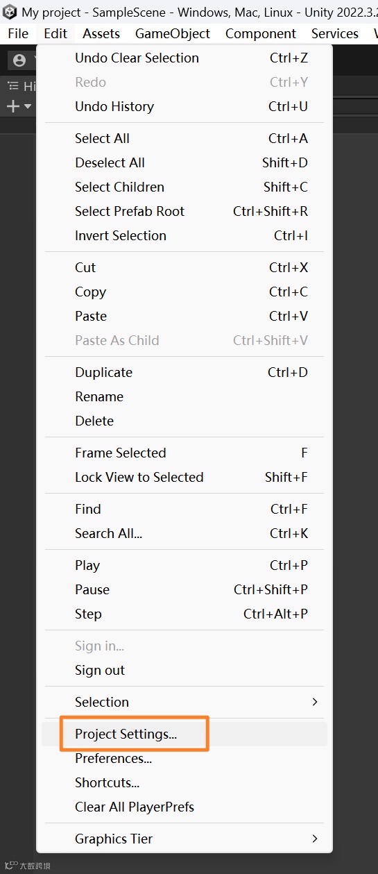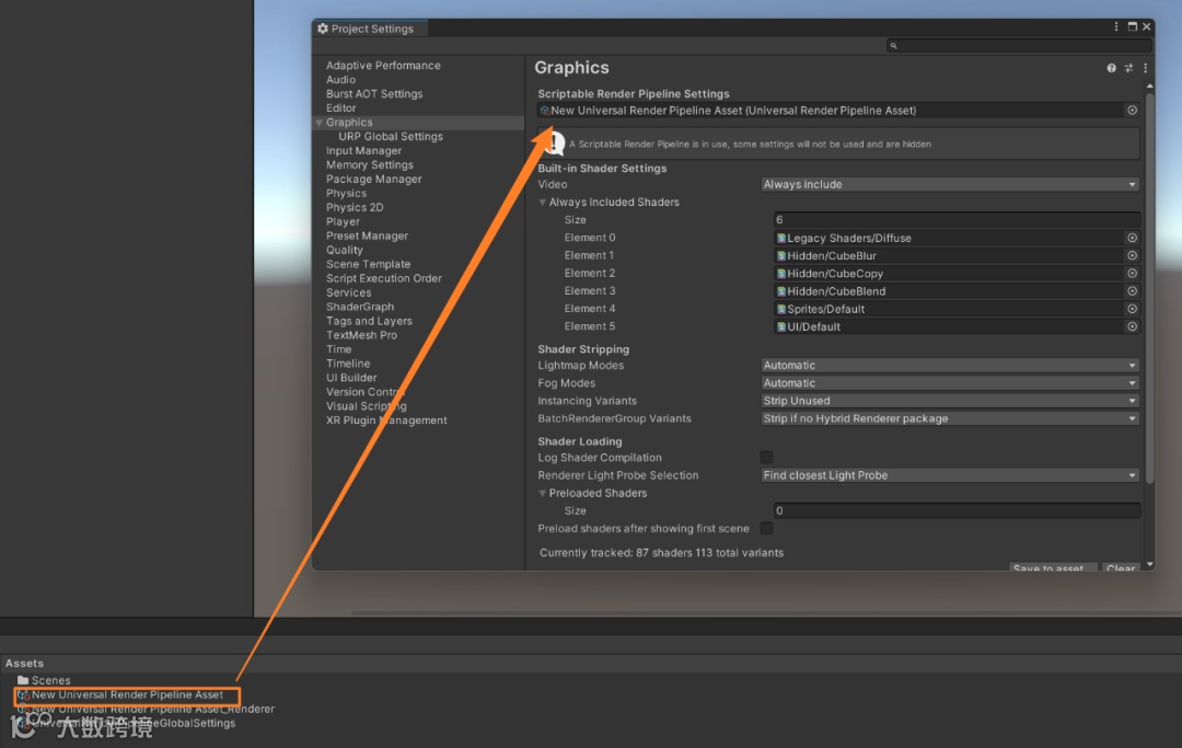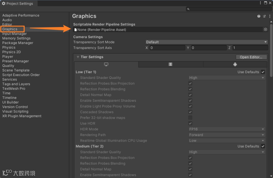 我们可以点开Edit—project settings,点击Graphics,可以看到工程里面的渲染管线依旧是None,此时的工程依旧是一个3D的工程。