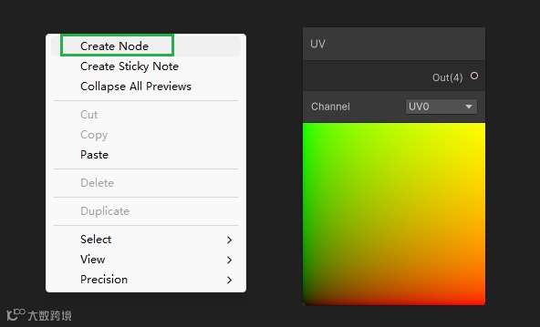 添加tiling 和offset:首先添加UV节点,右键控制界面,选择Create Node即可创建节点。输入UV,调出UV节点。