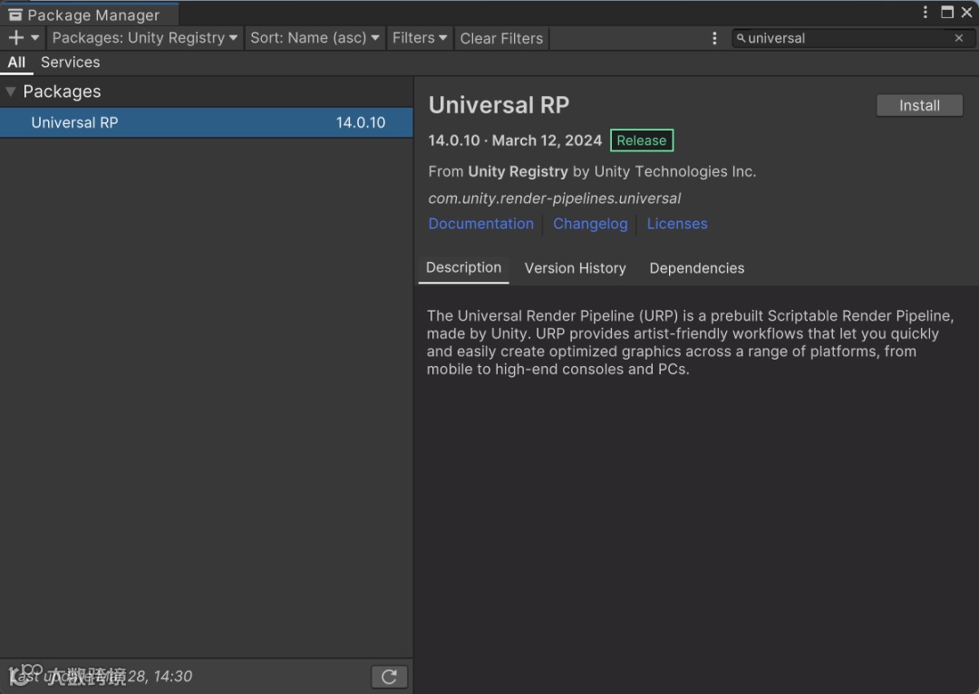 先打开Windows——Package Manager,选中unity仓库,如图2.1.2所示。选中仓库后,搜索universal,将universal RP添加到工程里。
