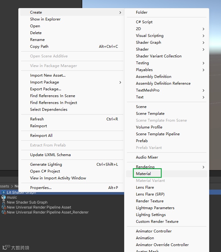 右键新建shader Graph材质:Create—Shader Graph—URP—Lit Shader Graph。