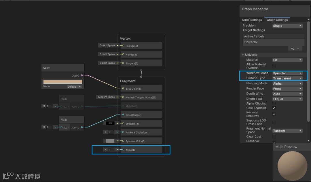 在使用时,需要将WorkFlow Mode 选择为Specular,如果将Surface Type选项修改为Transparent属性,这样在Fragment面板会给予我们提供一个“Alpha属性值”,来让我们修改该材质的透明状态(尤其是制作玻璃效果的时候!),而此时的Specular Color可以使用Color来控制材质表达物体高光反射时的颜色,其他的都与金属材质相同。