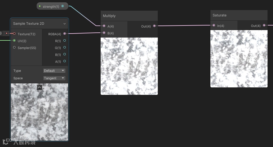 Multiply:将两个输入值相乘,当输入的是两张贴图的时候,输出结果与PS的正片叠底相同。在项目中经常会将贴图与参数相乘,让参数起到控制贴图亮度/强度的作用。