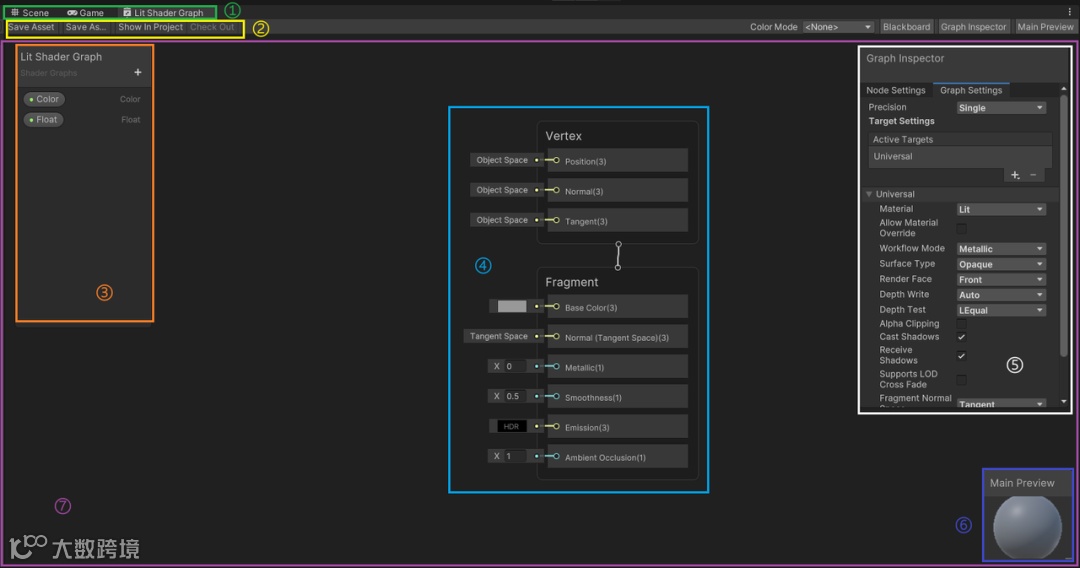 ⑦主要控制界面:用来摆放节点,链接shader graph属性。