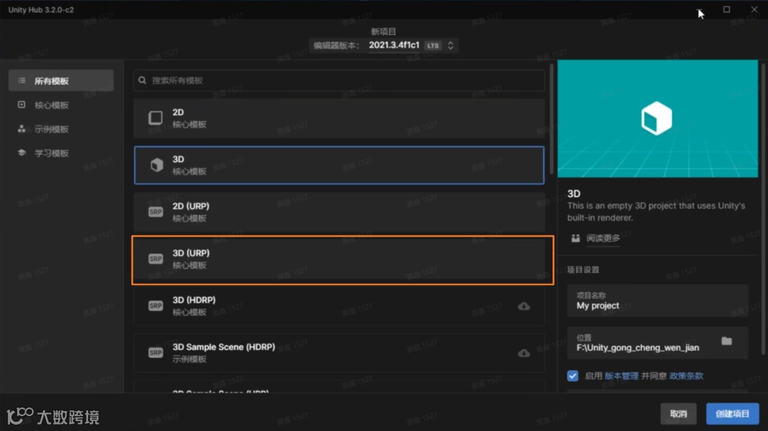在项目中需要与开发团队对齐unity的版本。如果是自主创建的话,优先选择URP管线的核心模板,如图1.2.1。需要注意的是,项目命名规范要避免中文路径和特殊符号。