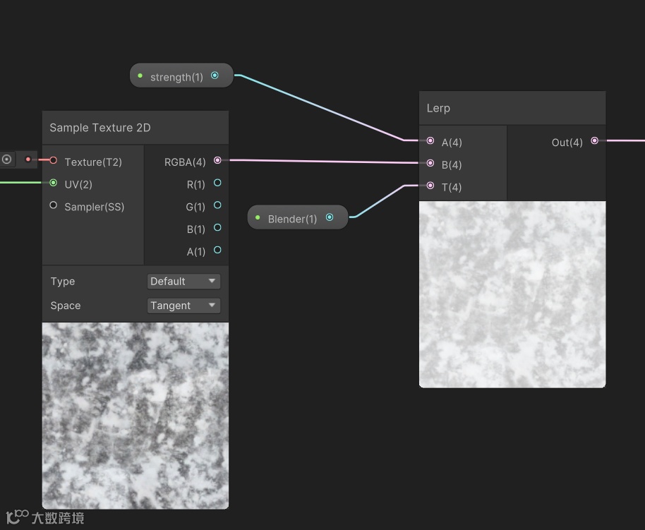 Lerp (Linear Interpolate):线性插值,混合两个输入值(如颜色过渡、透明度渐变)。