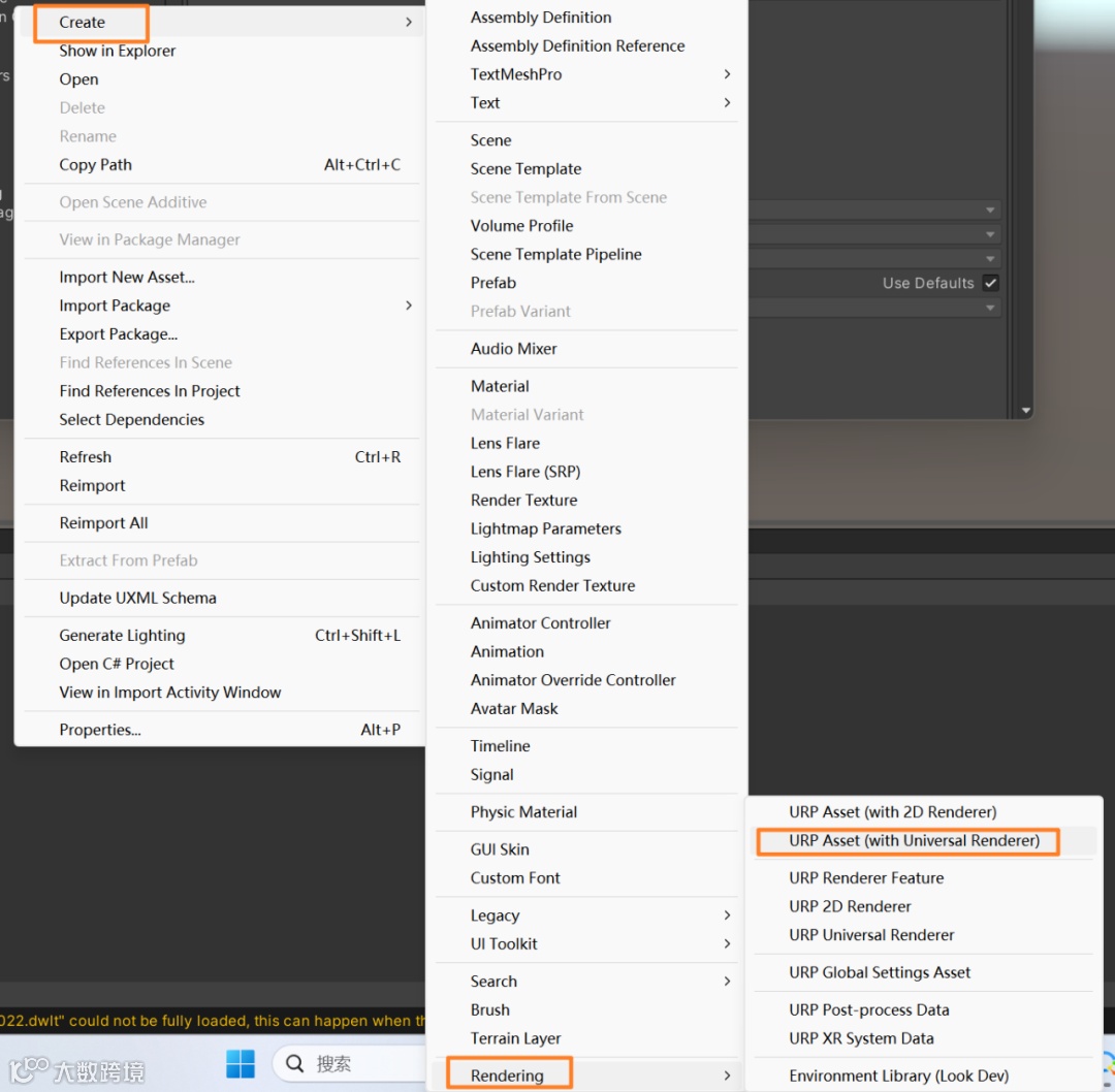 在空白处右键,调出Create—Rendering—URP Asset(with Universal Renderer),然后再将URP的资产拖入设置中,完成URP管线的项目配置,如图2.1.7所示。