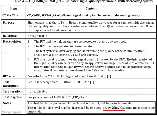针对1000BASE-T1 IOP测试的Signal Quality用例,草案第4.1.3节原文明确要求高斯噪声注入步长为25mV,见下图。