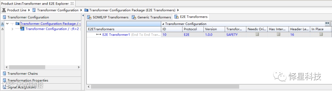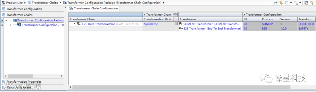 在下图所示的表格Transformer Chain Configuration中可以创建Data Transformation,每个Data Transformation表示一个Transformer Chain,通过创建Transformer Assignment,可以将SOME/IP Transformer和E2E Transformer关联到Data Transformation。在表格中的Transformer Kind列可以设置Data Transformation类别:
