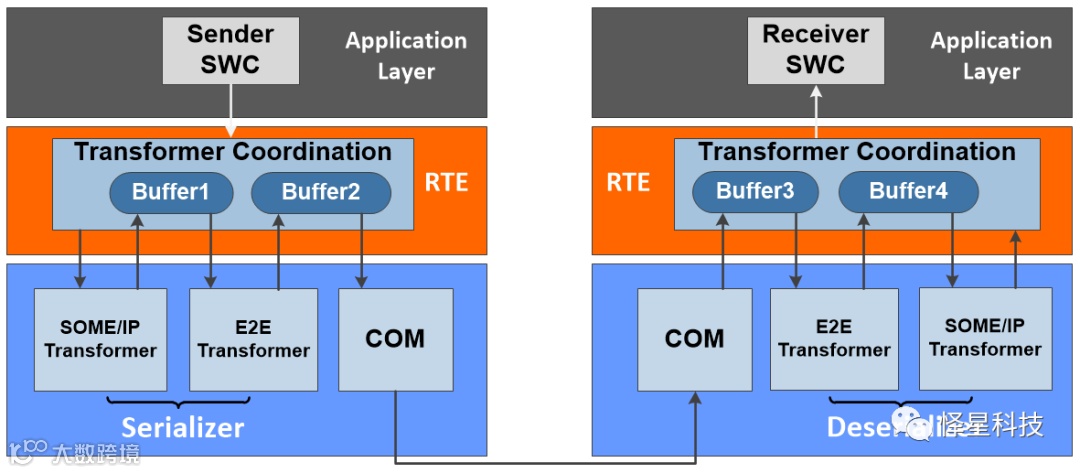 E2E Transformer位于RTE层以下,由RTE调用,实现的也是基于Data Element的数据保护。以上图为例,Ethernet数据从发送端SWC经过RTE进行传输,RTE首先调用SOME/IP Transformer,对数据进行SOME/IP序列化,序列化后的数据返回给RTE,再调用E2E Transformer进行E2E序列化,E2E Transformer调用E2E Library添加E2E控制字段,之后将数据再次返回给RTE,最后由RTE发送给COM模块。在接收端,COM模块接收到的数据分别进行E2E反序列化和SOME/IP反序列化,最后经过RTE传输至应用层SWC。