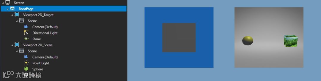 左边的平面用于接收右面场景渲染出来的贴图,右边的Viewport里是实际的场景(一个球和一个贴了森林图片的正方体)。