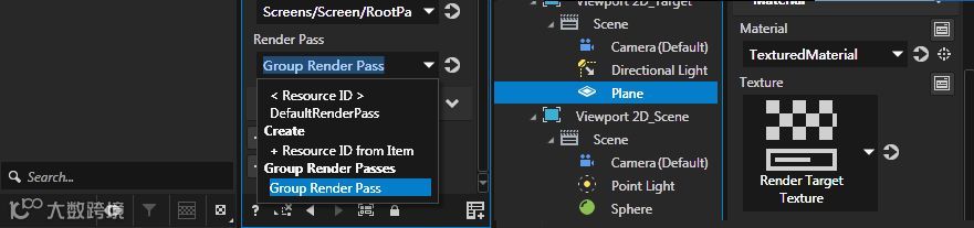 然后,我们将Viewport2D_Scene中的Render Pass修改为我们之前设置的Group Render Pass。同时,将Viewport2D_Target中Plane的材质贴图设置为生成好的Render Target Texture。