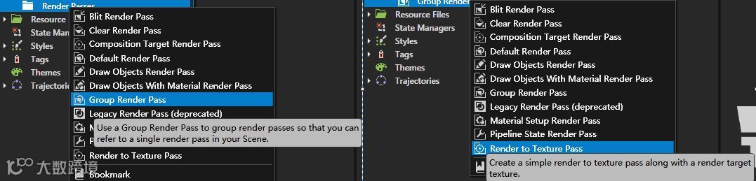 接下来,在Render Passes里建立一个Group Render Pass,并在Group Render Pass中创建一个Render To Texture Pass。