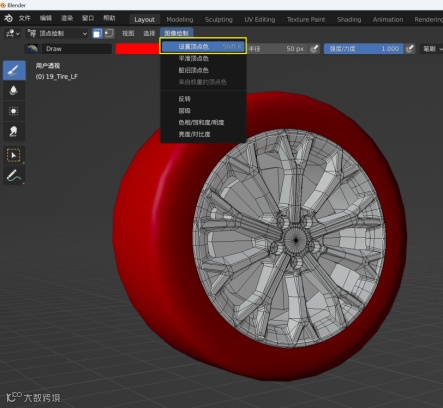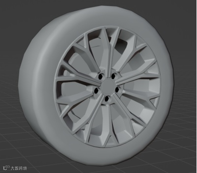 将模型的材质划分好之后,在Blender导入模型。我们以一个轮胎为例,进行顶点色制作。