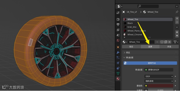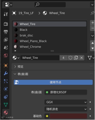 合并轮胎模型,可以在材质属性的页面看到已经划分好的轮胎材质。