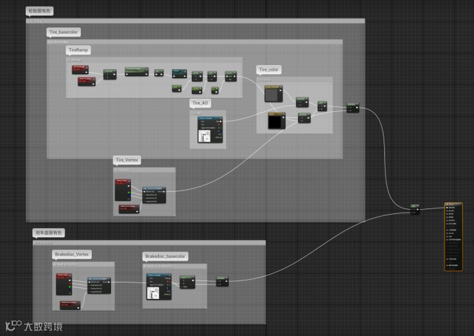 我们使用“add”节点,将轮胎和刹车盘的固有色合并到一起,再输出。