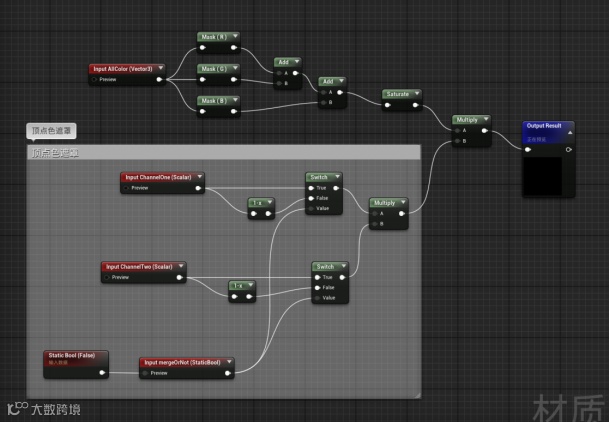 顶点色提取出遮罩之后,用法与Mask贴图/PS的蒙版完全一致,只需要将遮罩乘以遮罩内部的颜色,常数等数据,然后再输出即可。多个区域的遮罩可以使用“add”节点将相同的数据添加到一起输出。