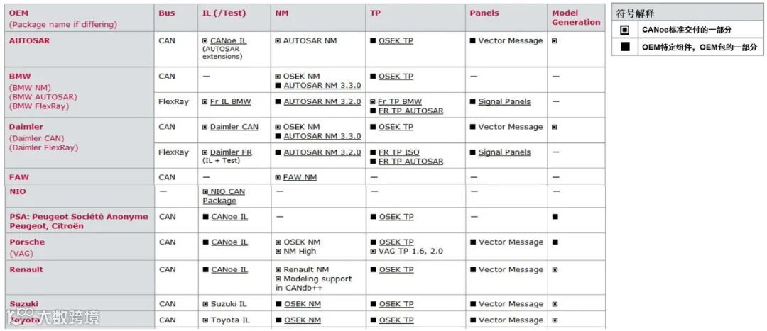 尽管通讯软件架构大体相似,但OEM在各层软件细节上仍有不同,例如:E2E报文计算方法,NM的自定义等。为此,CANoe针对不同的OEM开发了不同的OEM Package(定制化开发了dll)。