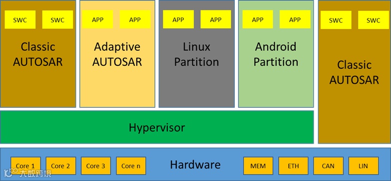 在座舱域控制器中,由于安全要求不同,需要运行不同的操作系统(比如Linux/QNX负责仪表、安卓负责信息娱乐系统),通过Hypervisor技术可以将不同的操作系统运行在同一个主控芯片。基于Hypervisor的系统架构,等效于给予智能座舱一个操作系统,用来协调不同的芯片、不同芯片底层软件、不同应用层软件,让整个架构和系统高效地工作起来。Hypervisor 技术的引入,使得硬件和软件资源可以按照产品需求,灵活的在不同的GUESTOS中分配。