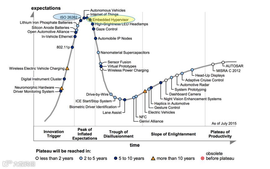 Gartner在2015年发布的技术成熟度曲线预测,2020-2025年内,Hypervisor技术将成为汽车智能座舱中最有可能实现大规模商业化的技术。