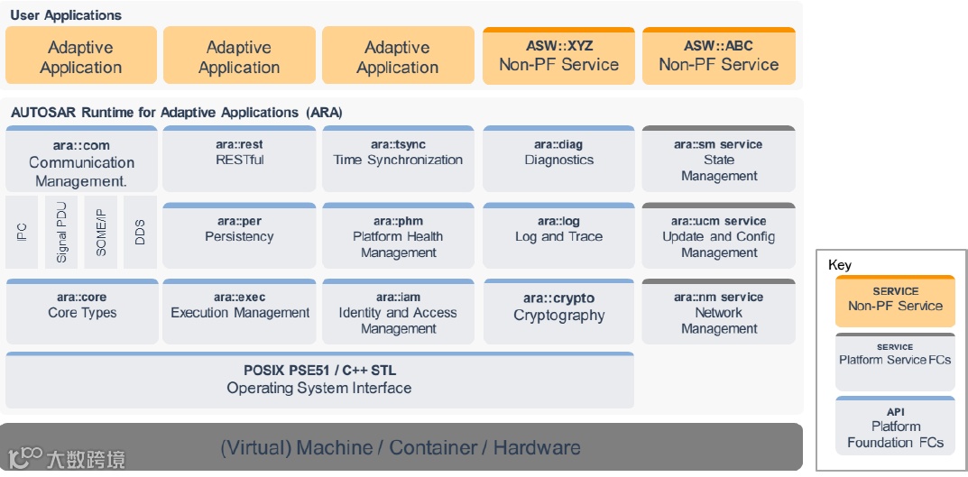 ARA是应用程序(AP中称为Adaptive Application)运行时的基础环境,可以提供多种本地功能供应用程序调用,这些本地功能在AP中统称为Function Clusters,其分为两个部分:Foundation Function Clusters和Service Function Clusters。