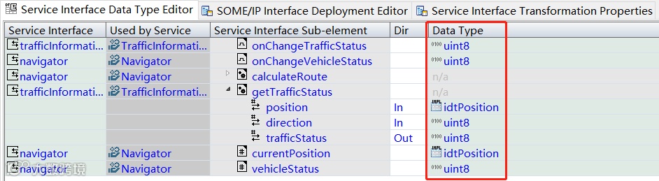 服务设计:服务是对功能单元的抽象描述;服务的定义包含服务的ID以及服务角色(服务提供方及服务消费方)的定义。本示例定义了两个服务:Navigator及TrafficInformation。