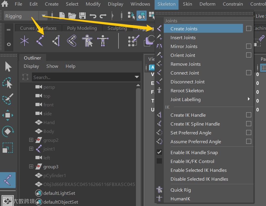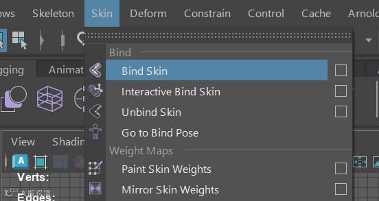 选择好骨骼与模型,再选择Skin—Bind Skin,即可将骨骼与模型绑定。