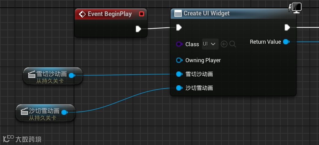 最后打开关卡蓝图,将场景中的关卡序列直接拖入到关卡蓝图中,将关卡序列连接到创建新控件节点,也就是调用UNG的节点,如图2.3.5所示,此时便完成了对关卡序列帧的调用。