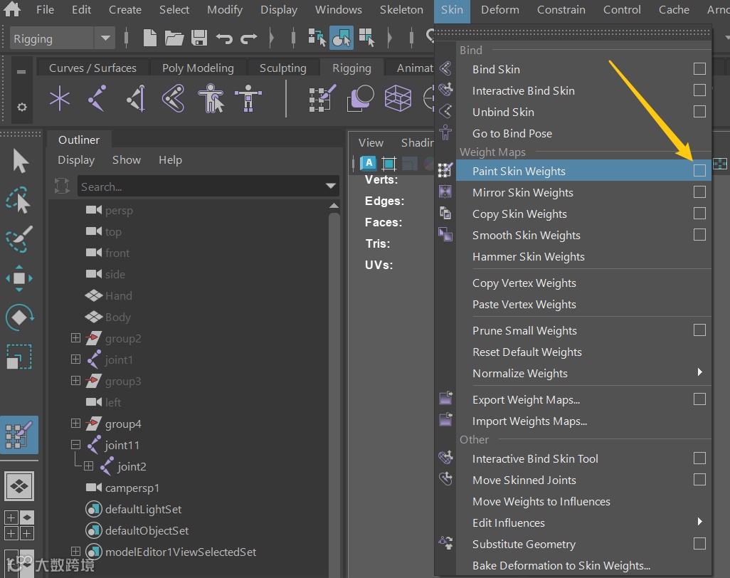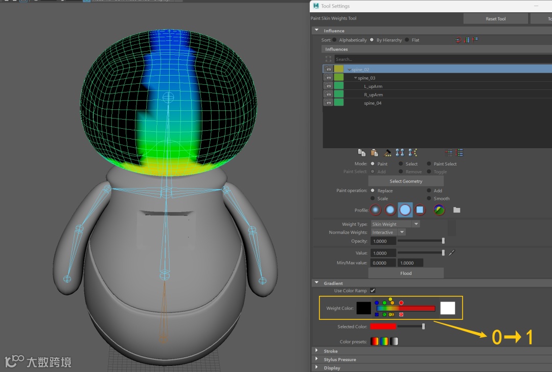 接下来选择Skin—Paint Skin Weights开始绘制蒙皮权重。