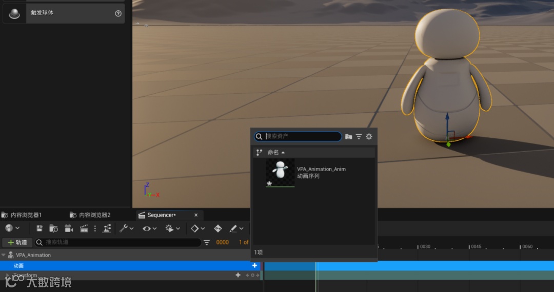 此时我们会发现关卡序列中并没有动画,需要在关卡序列中调用动画信息。我们在关卡序列中点击VPA轨道下的动画一行右侧的“+”,这时候就会跳出对应的动画序列,如图2.3.2所示。选中动画序列之后,动画就成功添加到关卡序列中去。