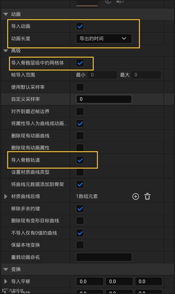 往下滚动,我们还需要勾选导入动画、导入骨骼层级中的网格体、导入骨骼轨道,在动画长度一项选择导出的时间即可。