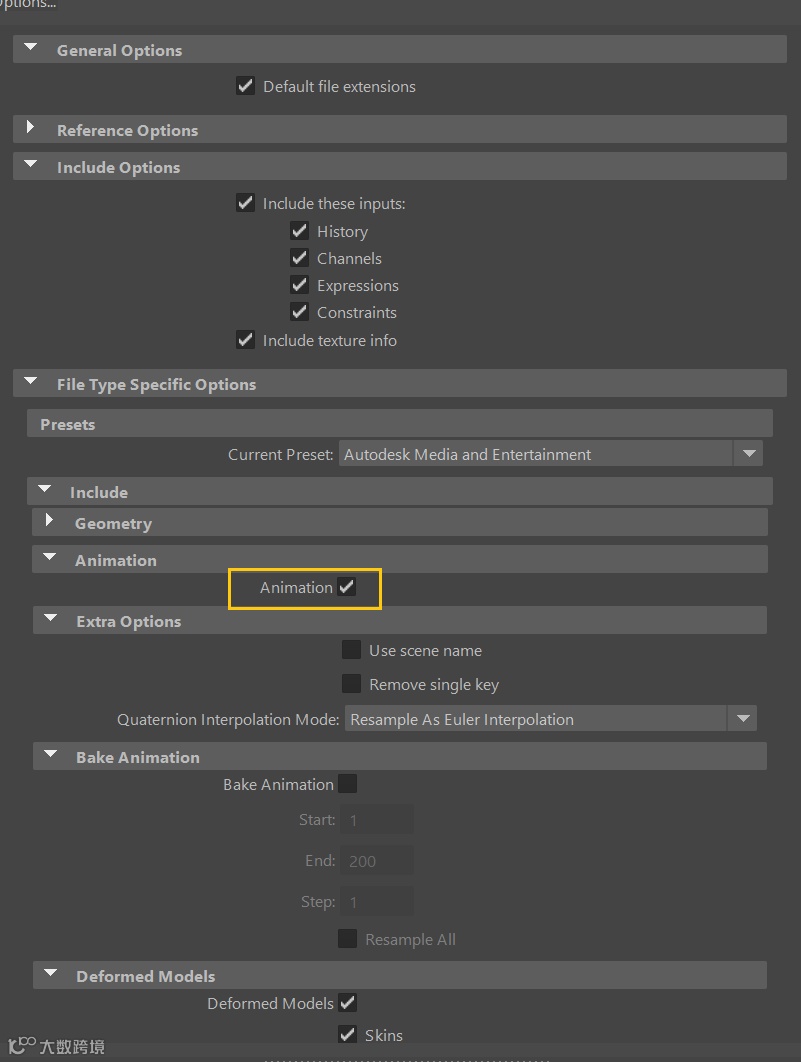 接下来选择骨骼动画与VPA模型,导出成fbx文件即可。切记在导出的时候一定要勾选上包括动画信息。