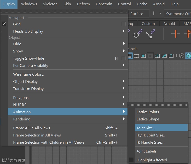 我们可以通过dispaly—Animation—Joint Size调用关节尺寸设置,来调节关节的大小。