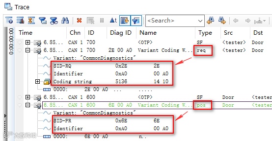 然后,查看Trace窗口,验证诊断服务(Variant Coding Write)请求被成功发送,并获得肯定响应,如下图所示。