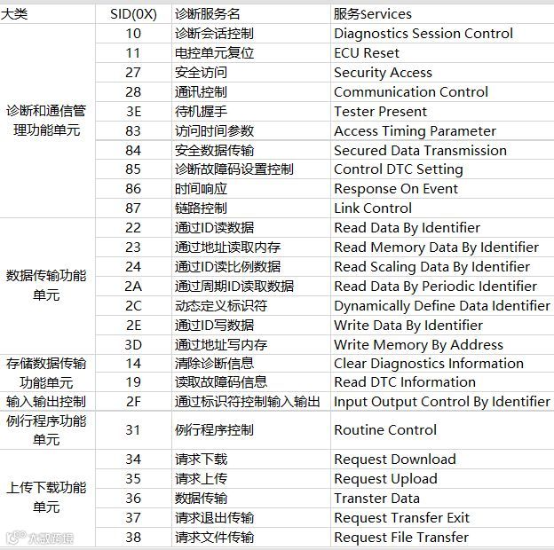 上图简单概括了UDS诊断属于触发型诊断事件,由客户端(Client)发送请求指令给服务器(Server),而后服务器(Server)对接收到的诊断请求进行响应,实现故障检测及软件刷写等功能。UDS诊断共支持26种诊断服务,诊断事件依据诊断服务建立和存在。