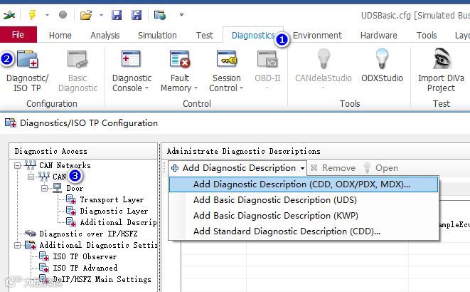 打开Demo后,首先需要学会诊断数据库配置。在Diagnostics窗口,点击Diagnostic/ISO TP Configuration →CAN→Add Diagnostic Description,添加对应要求的诊断数据库文件.cdd。